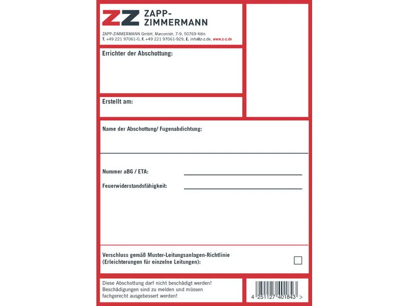 KENNZEICHNUNGSSCHILD ALLGEMEIN B16H00-0029 Zapp-Zimmermann für Systeme nach abZ / aBG / ETA