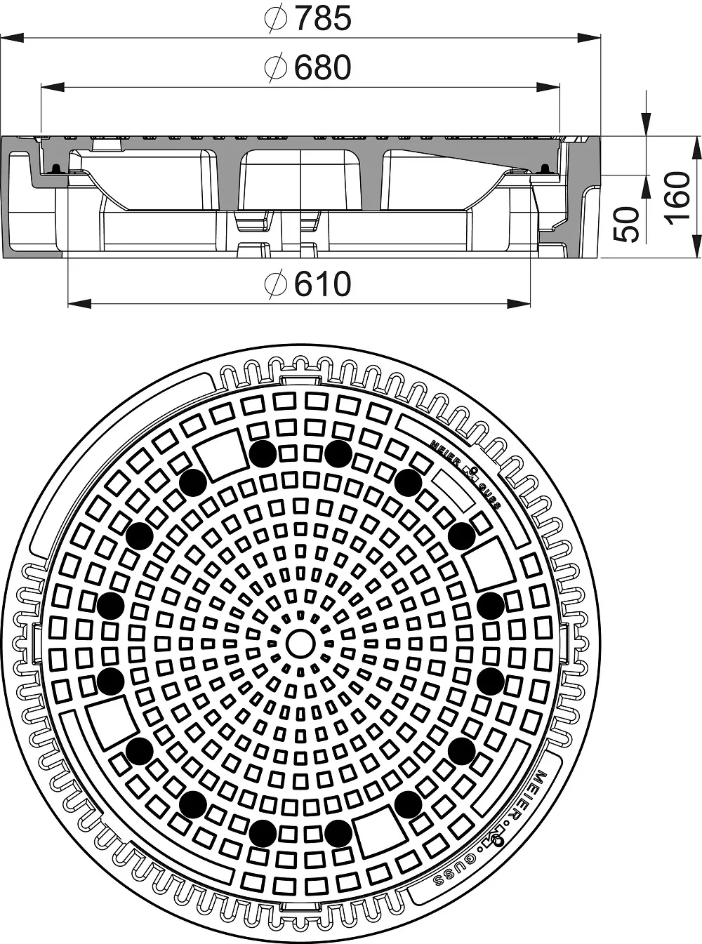 Rahmen: Gusseisen DIN 19584-1 bzw. 19584-7, Deckel: Gusseisen, dämpfende Einlage DUOMEIPREN® in Rahmen und Deckel