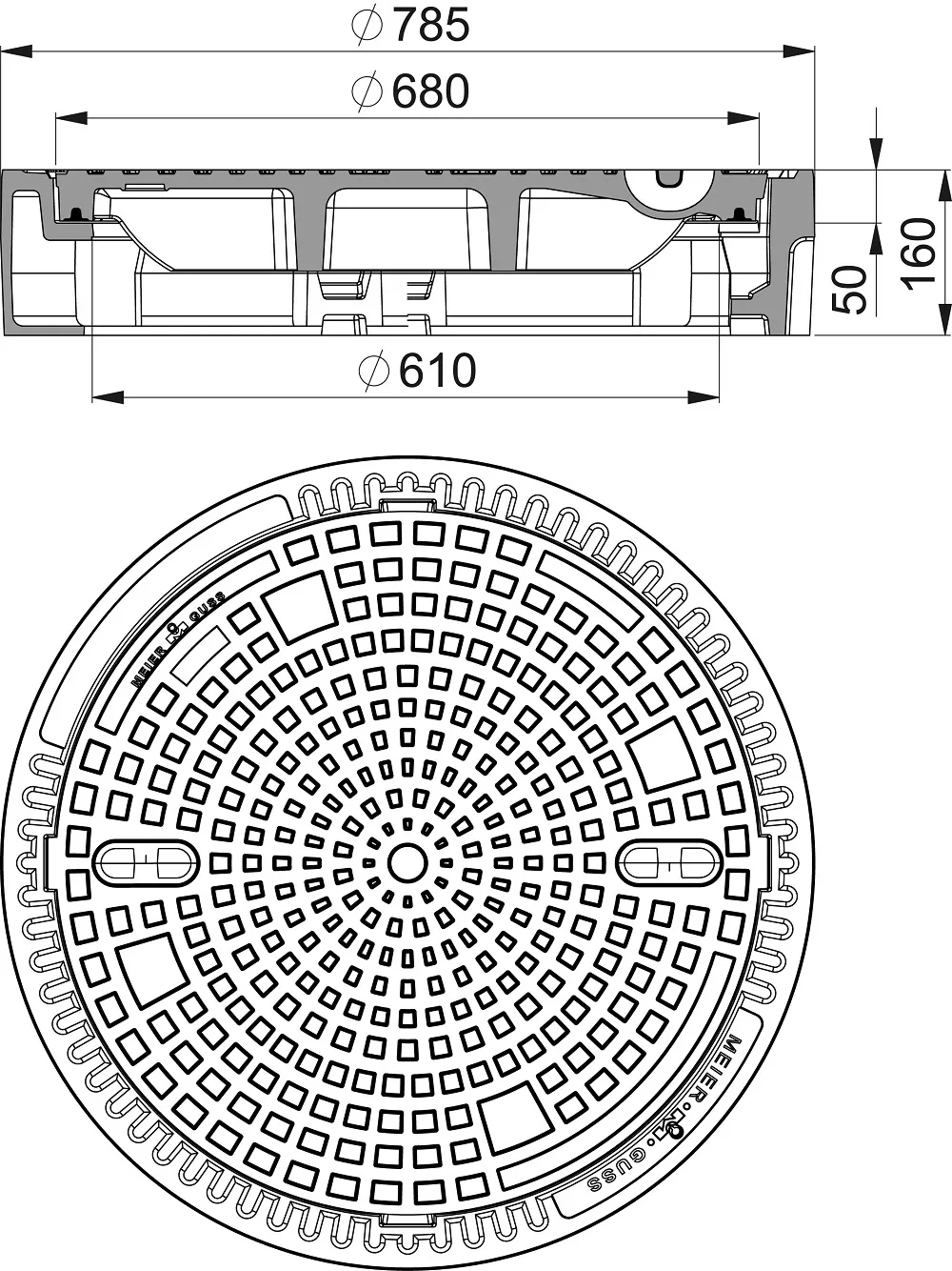 Rahmen: Gusseisen DIN 19584-1 bzw. 19584-7, Deckel: Gusseisen, dämpfende Einlage DUOMEIPREN® in Rahmen und Deckel